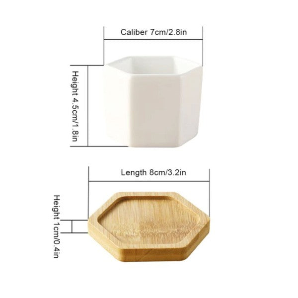 White ceramic hexagonal shape pot with bamboo tray. Made of high quality ceramic with smooth finish, easy to use and clean.